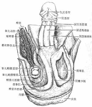 陰囊的皮膚薄而柔軟,有色素沉著、汗腺及皮脂腺,并含大量的彈性纖維,故富有伸縮性。淺筋膜內(nèi)缺少脂肪,含有稀疏的平滑肌纖維和致密結(jié)締組織以及彈性纖維,稱為肉膜。肉膜在中線向深部延伸成陰囊中隔,將陰囊分成左、右兩部,各容納睪丸、附睪及精索下部。